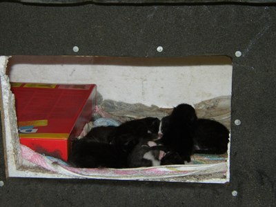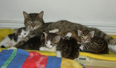 Neugierig, wie wir Frauen nun mal sind, musste ich natürlich dort reinschauen. Im Nest lagen fünf kleine Katzenwelpen! Sie waren so klein, dass die Augen und Ohren noch zu waren. Jetzt nur nicht anfassen, denn sonst kann es passieren, dass Mama Katze die Kleinen nicht mehr annimmt.