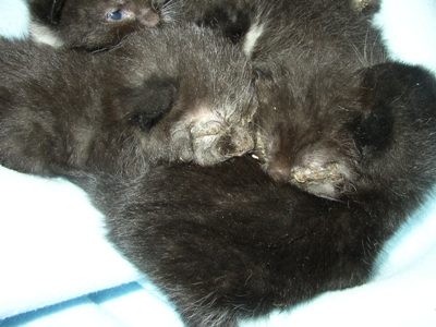 So bin ich dann jeden Tag zur BSR gefahren und habe die Miezchen dort gefüttert. Nach 14 Tagen habe ich intensiver in das Nest geschaut, denn die Kleinen müssten nun mal so langsam die Augen öffnen. Doch es war schrecklich, was ich da zu sehen bekam! Die Augen konnten gar nicht aufgehen, da eine dicke Schicht Eiter die Augen zudrückte. Ich habe dann alle Babys angeschaut, alle waren mit Katzenschnupfen infiziert! Da habe ich dann nicht lange gezögert und habe sie alle zum Tierarzt geschafft. Es war auf der allerletzten Minute, wie mir mein Tierarzt mitteilte. Einen Tag länger ohne Behandlung und sie wären daran gestorben.