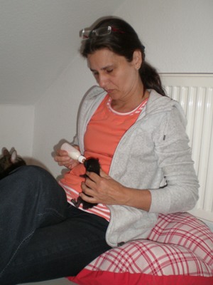 Mittlerweile bin ich im Tierschutz dafür bekannt, dass ich mich am Besten mit der Aufzucht von kleinen Katzenwelpen verstehe. Zu mir kommen jetzt die Babys, die keine Mama mehr haben und die mit der Flasche großgezogen werden.